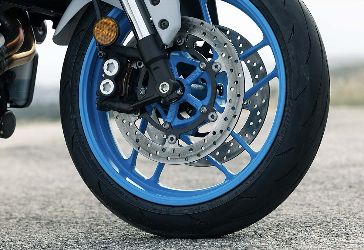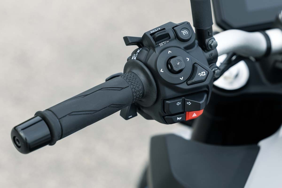 Der Y-AMT-Version vorbehalten bleibt der serienmäßige Tempomat. Er arbeitet in 1-km/h-Schritten vom 3. bis zum 6. Gang und im Geschwindigkeitsbereich von 40 bis 180 km/h. Eine Parkbremse braucht die Automatik-MT-07 nicht: Stellt man sie im elektronisch eingelegten 1. Gang ab, verhindert dieser automatisch das Wegrollen, wie bei jedem anderen Motorrad auch. Beim Ampelstopp legt das Y-AMT-Getriebe automatisch die erste Gangstufe ein. Versehentliches Runterschalten bei (zu) hohen Drehzahlen schließt die Schaltelektronik aus. Das beruhigt Fahrschüler und Fahrlehrer. Für zuverlässiges Ankern sorgt eine hydraulische Doppelscheibenbremse vorn mit radial montierten Vierkolbenbremszangen.